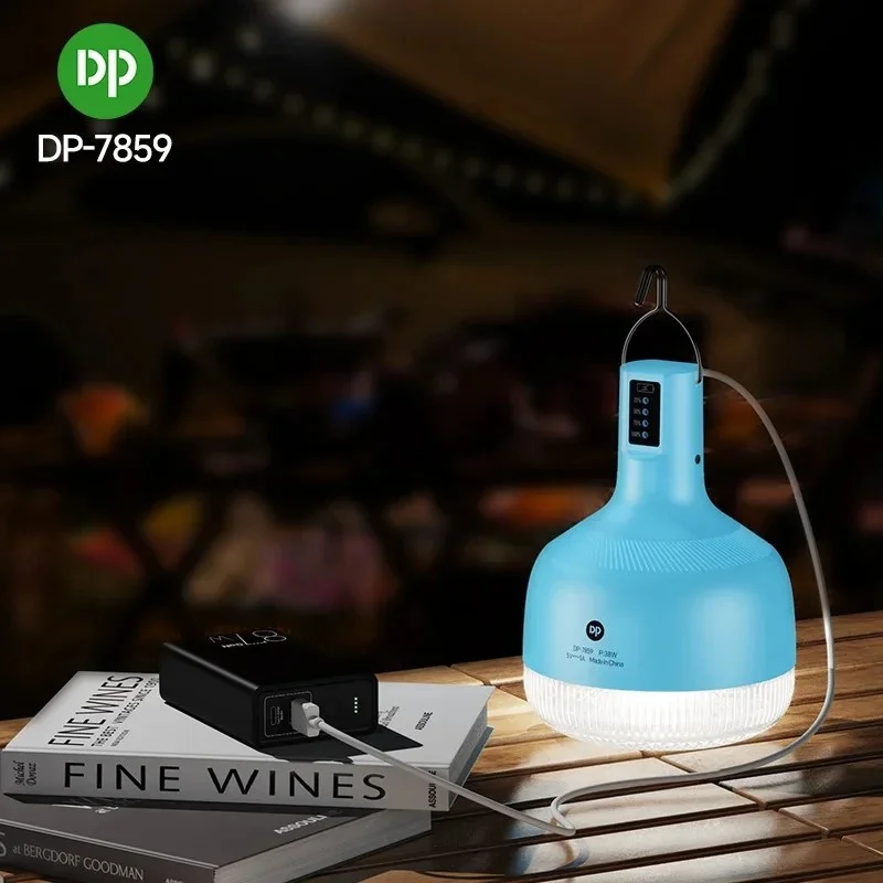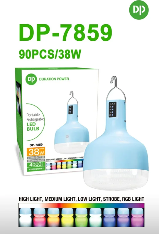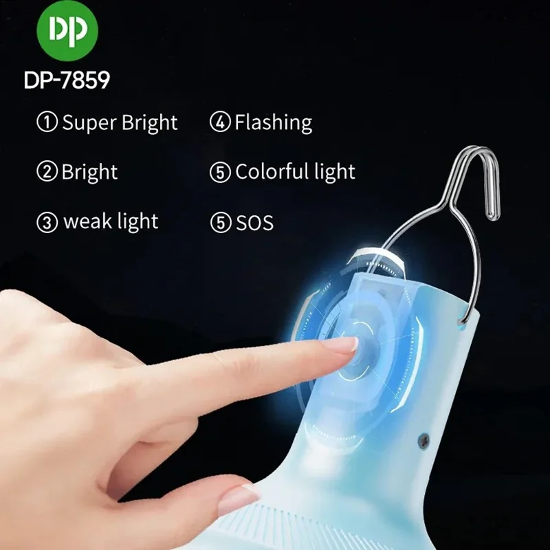 لامپ LED شارژی قابل حمل مدل DP-7859 است که مخصوص کمپینگ، سفر، خانه و مواقع اضطراری طراحی شده. قابلیتها و ویژگیهای آن عبارتند از:🔋 منبع تغذیه و شارژدارای باتری لیتیومی داخلی 4000 میلیآمپرساعت (قابل شارژ)شارژ از طریق کابل USBقابلیت استفاده طولانیمدت پس از هر بار شارژ💡 مشخصات نوریتوان مصرفی: 38 واتنوردهی قوی و گستردهچندین حالت نوری:نور قوی (High Light)نور متوسط (Medium Light)نور کم (Low Light)حالت چشمکزن (Strobe)حالت SOS برای شرایط اضطراری🎨 امکانات ویژهدارای نور رنگی RGB (چند رنگ متنوع برای فضاهای مختلف و تزئینی)امکان انتخاب رنگ دلخواه یا تغییر خودکار بین رنگها⚙️ طراحی و ساختطراحی قابل حمل و سبکدارای قلاب برای آویزان کردن در چادر، منزل یا هر مکان دلخواهبدنه مقاوم و مناسب برای استفاده در فضای باز📊 نمایشگردارای نمایشگر میزان شارژ باتری روی بدنه👉 این لامپ یک وسیله چندکاره است؛ هم میتواند به عنوان چراغ مطالعه و نور اضطراری استفاده شود و هم به عنوان چراغ تزئینی رنگی در سفر یا خانه