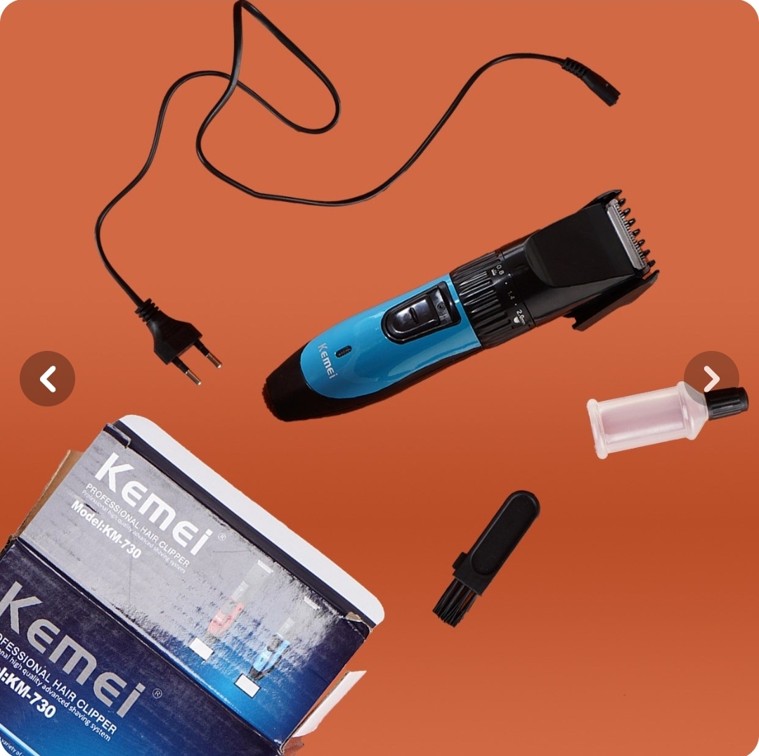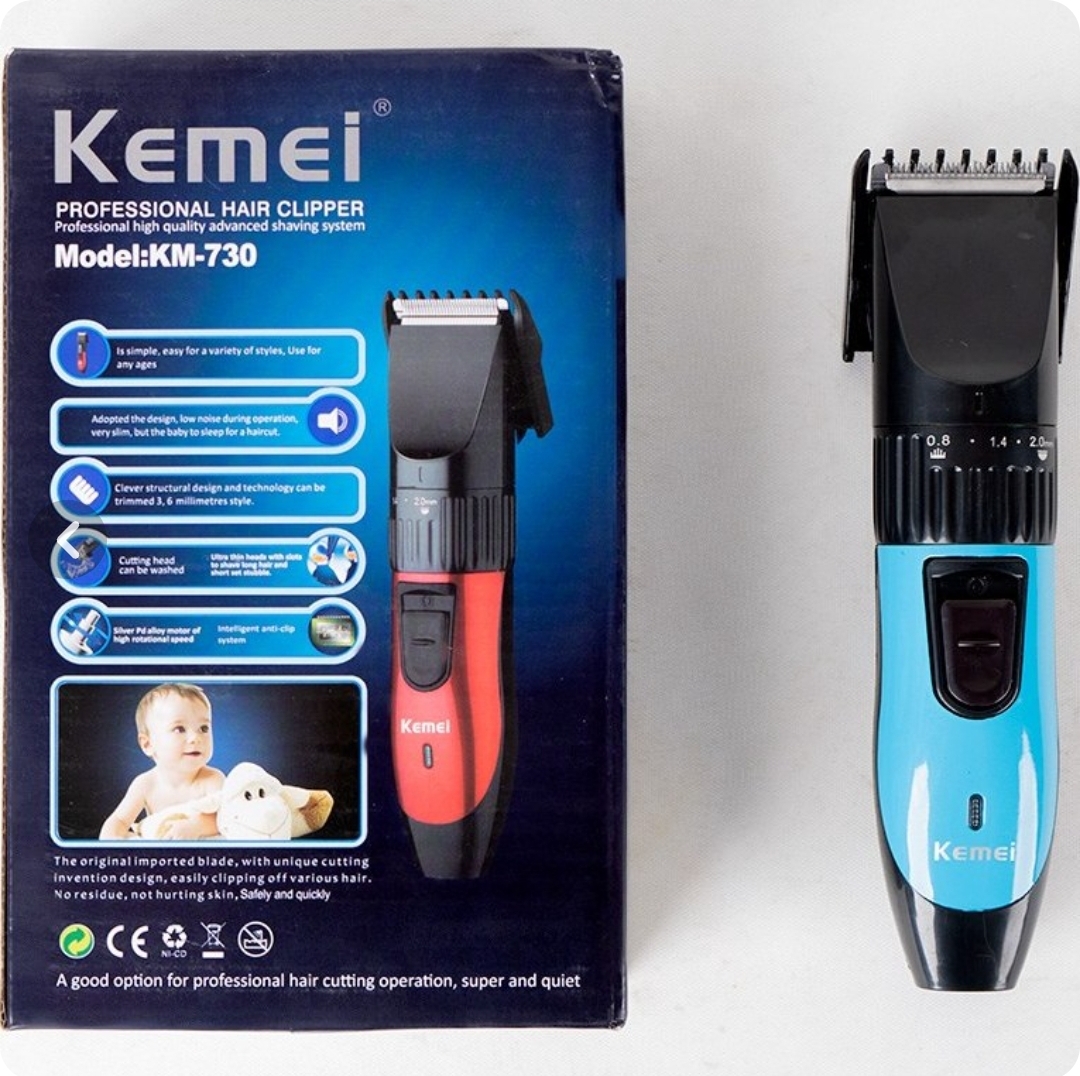 ماشین اصلاح Kemei مدل KM-730تکنولوژی اصلاح:برش مستقیم جنس تیغه:استیل ضد زنگ منبع تغذیه:برق خانگی(با سیم)، باتری قابل شارژ(بی سیم) همراه آن وجود دارد اقلام همراه : دفترچه راهنما، کابل برق، برس تمیزکننده ،روغن ماشین اصلاح اندازه اصلاح : 0.8 تا 2.5 میلیمتر قابلیت شستشو : ندارد. مدت شارژ کامل : 480 دقیقه مدت استفاده پس از شارژ : 30 دقیقه ابعاد : 16*4*2 سانتی متر....چراغ نشانگر: دارد. کشور سازنده : چین. رنگبندی : آبی ، قرمز ( ارسال به صورت رندوم)