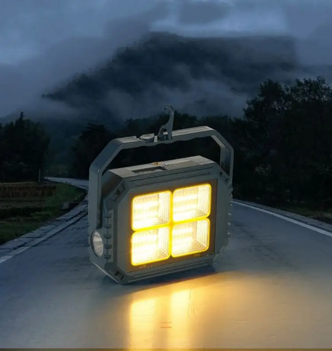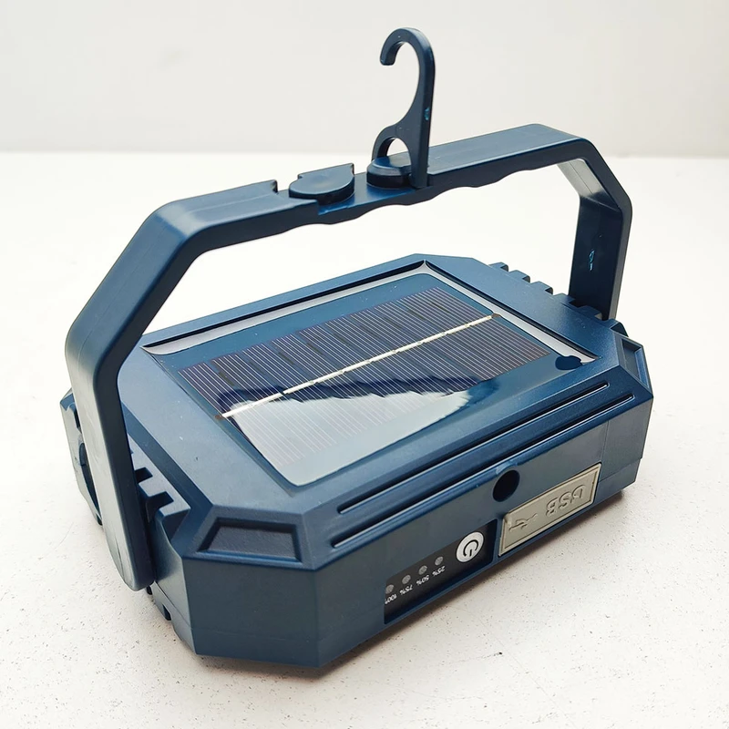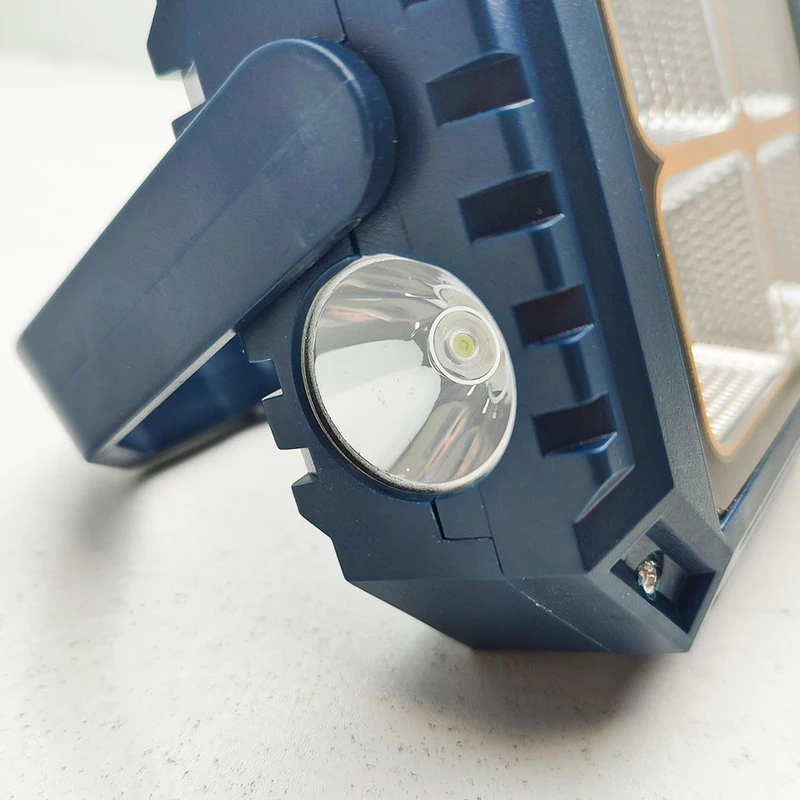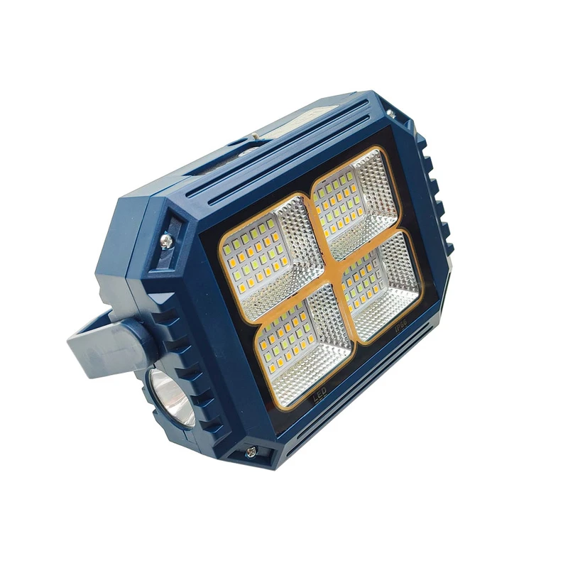 این چراغ شارژی یک نور افکن قوی و خوش ساخت با طراحی استاندارد است که مناسب روشنایی بیرونی در شب، برای کمپینگ، کوهنوردی، معدن، تعمیر ماشین، نگهبانی و… است. در ساخت این محصول از مواد با استحکام پلاستیکی ABS استفاده شده است. تامین انرژی این چراغ قوه از طریق باتری داخلی قابل شارژ توسط پورت USB همراه و با پنل خورشیدی است که به راحتی در صورت نبود برق با انرژی خورشیدی شارژ می شود. این چراغ قوه در صورت شارژ کامل حدود 4 ساعت با حداکثر روشنایی نوردهی می کند. بهره مندی از کلید فیزیکی بر روی بدنه به منظور روشن خاموش و تغییر حالات نوردهی از دیگر ویژگی های این محصول است و همچنین بهره مندی از پنل خورشیدی بر روی بدنه به منظور شارژ دستگاه، دارای پورت USB جهت شارژدهی (به عنوان پاوربانک) در مواقع اضطراری دارد. این چراغ قوه شارژی دارای 1 عدد چراغ قوه از نوع LED لنز دار در رو به رو و همینطور یک پروژکتور تشکیل شده از 4 SMD در قسمت جانبی که نور آفتابی مهتابی نچرال و حالت پلیسی را داراست. مجهز بودن به دسته جهت حمل آسان تر از مزیت های این محصول است.