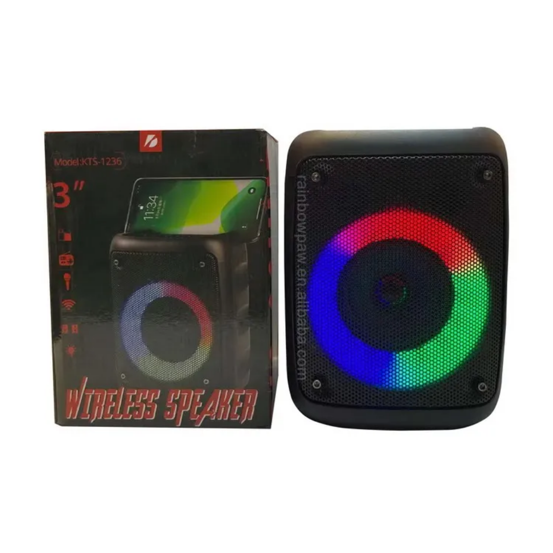 نوع اتصال: دانگل USB و بلوتوثنسخهی بلوتوث: 5میکروفون داخلی: داردرابطها: Bluetoothجنس بدنه: پلاستیکدارای قابلیت رقص نوراسپیکر بلوتوثی قدرت مند مدل KTS 1576 با توان خروجی 10 وات و رقص نور بسیار بزرگ و جذاب چند حالته که علاوه بر ایجاد صدای رسا و با کیفیت، با نورپردازی زیبا باعث شادی مضاعف محفل شما می شود.KTS 1576 پلیری جالب با قابلیت رقص نور است هم چنین این اسپیکر اندازه کوچکی در ابعاد 17.5 × 13.4 × 13.4 سانتیمتر دارد که باعث میشود حمل و نقل آسانی داشته باشد.دارای درایو سایز 3 اینچی و قدرت خروجی 10 وات است، محدوده انتقال بیسیم اسپیکر تا 10 متر است و از بلوتوث نسخه 5.0 پشتیبانی میکند.اسپیکر همچنین دارای شیار کارت TF، پورت USB و رادیو FM است که به شما امکان پخش موسیقی از منابع مختلف را میدهد.